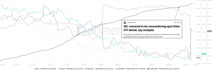 با توجه به منبع دادههای زنجیرهای Santiment، عرضه اتر توسط نهادهایی با موجودی 10 میلیون تا 100 میلیون ETH (سیاه) از 20 می، زمانی که شایعات در مورد کمیسیون بورس و اوراق بهادار ایالات متحده (SEC) منتشر شد، حدود 0.5 درصد افزایش یافته است. بررسی مجدد نسبت به رد ETF نقطه اتر آغاز شد.