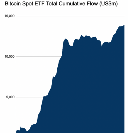 ETF های بیت کوین نقطه ای از زمان راه اندازی خود در ژانویه، ورودی خالص 13.85 میلیارد دلاری داشته اند.