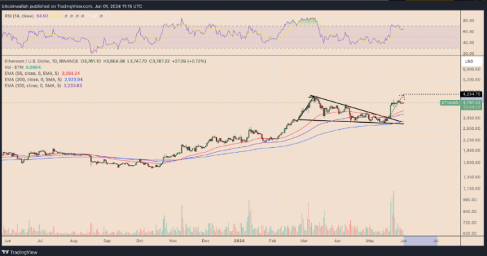 در 20 می، با افزایش حجم معاملات، قیمت اتریوم از خط روند بالایی وج شکسته شد، که نشان دهنده تمایل آن برای رسیدن به هدف صعودی الگو در حدود 4255 دلار تا پایان ژوئن است که 12.65 درصد نسبت به سطوح قیمت فعلی افزایش یافته است.