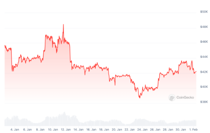 علیرغم اینکه هر ده ETF بیت کوین در ماه ژانویه 1.6 درصد به کل دارایی ها اضافه کردند، بیت کوین طی 30 روز گذشته کاهش قابل توجهی در قیمت داشته است. بر اساس داده های کوین جکو، پس از شروع سال با حدود 45000 دلار، بیت کوین با تلاطم قابل توجهی مواجه شد و در 23 ژانویه به زیر 39000 دلار سقوط کرد. در زمان نگارش این مقاله، بیت کوین با قیمت 42215 معامله می شود که در 30 روز گذشته حدود 8 درصد کاهش داشته است.