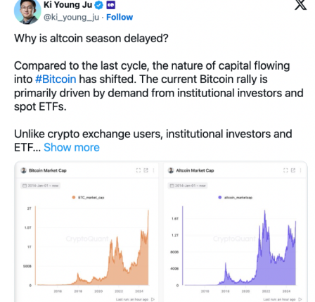 کی یانگ جو، مدیر عامل کریپتوکوانت، در پست دوم دسامبر در X گفت: «آلت سیزن دیگر با چرخش دارایی از بیت کوین تعریف نمی شود.