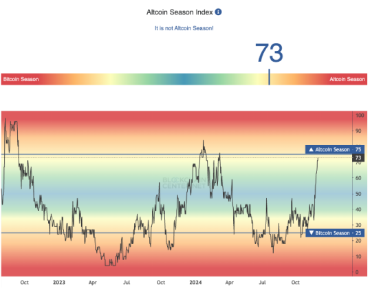 این شاخص اساساً نشان می دهد که 73 درصد از 50 آلتکوین پیشرو در 90 روز گذشته عملکرد بهتری از بیت کوین داشته اند. از آنجایی که این شاخص طی چند روز اخیر به شدت افزایش یافته است، در حال نزدیکتر شدن به آستانه ۷۵ درصدی است.