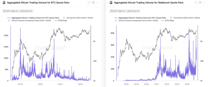 در همین حال، نمودار زیر در سمت راست افزایشی را در حجم کل معاملات آلتکوین برای جفتهای استیبل کوین نشان میدهد که همزمان با رشد قیمت ETH افزایش یافته است.