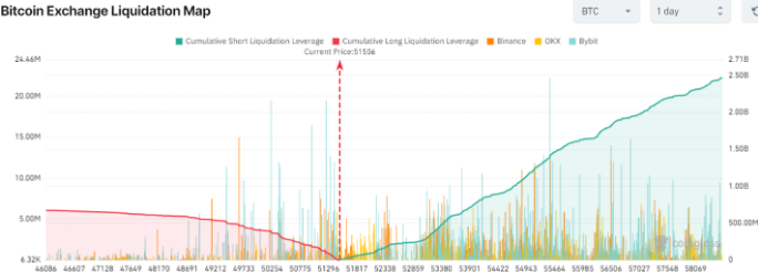 اگر قیمت بیت کوین به کمتر از 49400 دلار برسد، نقدینگی کوتاه بیت کوین به بیش از 520 میلیون دلار در همه صرافی ها می رسد.