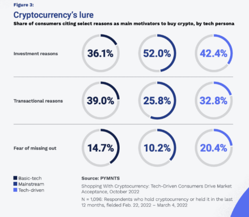 بر اساس این نظرسنجی، اکثر مصرف کنندگان ، 52 درصد، که از ارزهای دیجیتال به دلایل سرمایه گذاری استفاده می کنند، کاربران اصلی فناوری هستند. افرادی که فناوری محور هستند یا دانش پایه فناوری دارند به ترتیب با 42.4 درصد در رتبه دوم و با 36.1 درصد در رتبه سوم قرار دارند.