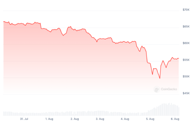 بر اساس دادههای کوین جکو، در 5 آگوست، بیت کوین برای اولین بار از فوریه 2024 به زیر 50000 دلار سقوط کرد و برای مدت کوتاهی به 49800 دلار سقوط کرد . کاهش قیمت بسیاری از سودهای بیت کوین را در چند ماه گذشته از بین برد، زیرا بیت کوین بیش از 20 درصد از حدود 63000 دلار در 1 آگوست سقوط کرد و سپس در حدود 55000 دلار بهبود یافت.پ