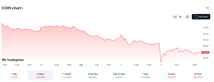 همزمان با سقوط بیت کوین، سهام کوین بیس در 5 آگوست 20.7 درصد سقوط کرد و به 173 دلار در هر سهام سقوط کرد. پس از بهبودی بعدی، سهام کوین بیس در روز دوشنبه به قیمت 189.5 دلار بسته شد که حدود 7 درصد کاهش داشت، داده های تریدینگ ویو نشان داد.