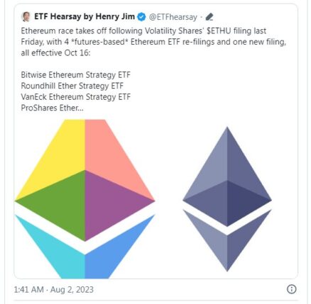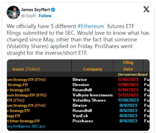 پرونده های جداگانه ارسال شده به کمیسیون بورس و اوراق بهادار ایالات متحده که بررسی شده است، برنامه های مربوطه را از قبیل گری اسکیل، VanEck، Bitwise، Volatility Shares، پروشرز و Round Hill Capital نشان می دهد.