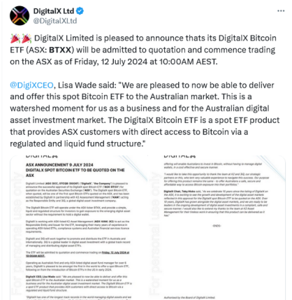 ETF بیت کوین دیجیتال ایکس در تاریخ 12 ژوئیه تحت عنوان BTXX فهرست می شود و دومین ETF بیت کوین پس از ونک در ماه ژوئن در ASX تایید می شود.