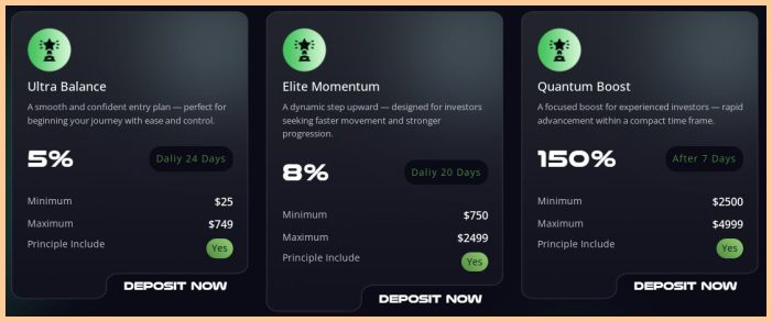 از 750 دلار تا 2499 دلار با سود روزانه 8 درصد به مدت 20 روز. (اصل سرمایه همراه با سود روزانه برمیگردد) (سود خالص 60 درصد).