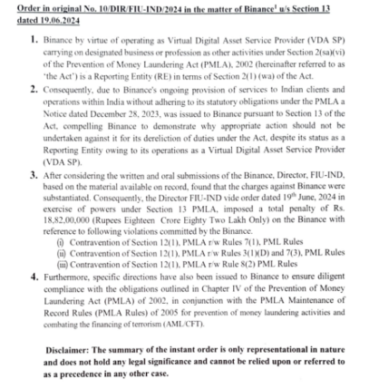 با این حال، در اطلاعیه FIU اشاره شده است که بر اساس مطالب موجود در پرونده، اتهامات علیه Binance پس از بررسی اظهارات کتبی و شفاهی مدیر ثابت شده است.