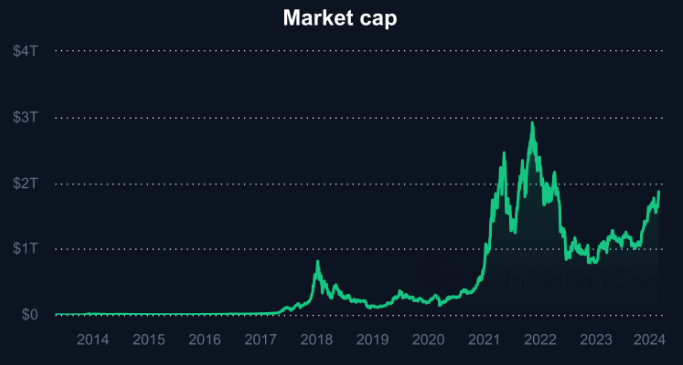 پیش از این، بیت کوین در نوامبر سال 2021، در طی یک روند صعودی که در نهایت بیت کوین را به بالاترین رقم تاریخی خود یعنی 69000 دلار رساند، نقطه عطف ارزش بازار 1 تریلیون دلاری را ثبت کرد . به موازات آن، روند صعودی در سراسر اکوسیستم کریپتو گسترش یافت و برای اولین بار، مجموع ارزش بازار ارز دیجیتال 3 تریلیون دلار را به ثبت رساند.