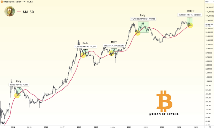 به گفته تحلیلگر معروف Titan of Crypto، بیت کوین اخیراً یک سطح حمایت کلیدی در نمودار هفتگی را مجدداً آزمایش کرده است، که می تواند آن را برای یک رالی بالاتر از 90,000 دلار قرار دهد.