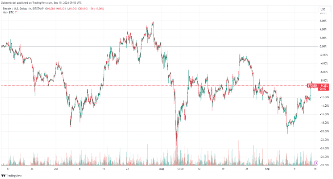 بیتکوین در 14 سپتامبر، برای اولین بار از 30 آگوست، بالاتر از مرز روانی 60000 دلار بهبود یافت. طبق دادههای بیت استمپ، قیمت بیتکوین در یک روند نزولی بیش از سه ماهه است که طی آن بیش از 9 درصد سقوط کرد.