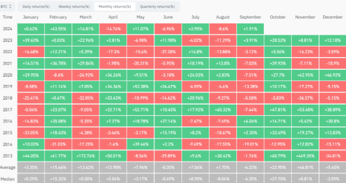 براساس دادههای کوین گلس، سپتامبر از لحاظ تاریخی، ماه عملکرد ضعیف قیمت بیتکوین بوده است، با میانگین بازدهی -4.69 درصد، آن را به نزولیترین ماه بر اساس میانگین بازدهی تبدیل کرده است.