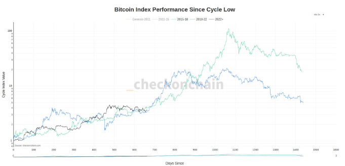 بیت کوین دقیقاً در همان نقطه دو چرخه گذشته از زمان پایین بودن قرار دارد. من مقایسه چرخه پایین را بیشتر ترجیح میدهم، زیرا زمان روانشناختی لازم برای بهبود سرمایهگذاران از بازار نزولی را توصیف میکند.»