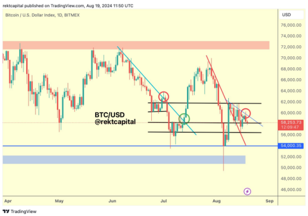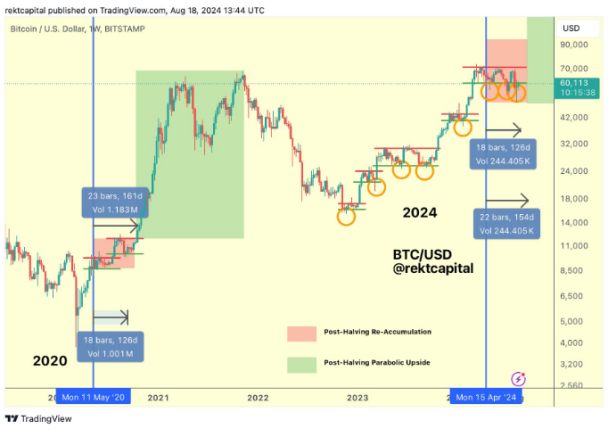 به گفته تحلیلگر معروف Rekt Capital، قیمت بیت کوین ممکن است بر اساس الگوهای نمودار قبلی پس از نصف شدن، در مسیر شکست قریب الوقوع در ماه سپتامبر باشد.