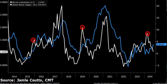 به گفته این تحلیلگر، نقدینگی رو به رشد جهانی از عرضه پول M2، همراه با وجوه قابل معامله در مبادلات بیت کوین (ETFs)، “راه اندازی کامل” را برای بیت کوین ایجاد می کند.