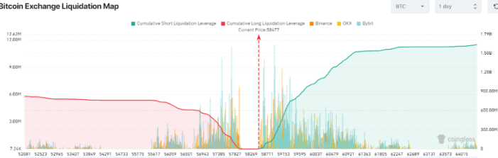 اگر بیت کوین به بالای 59900 دلار بازیابی شود، انحلال بیت کوین کوتاه مدت از 1 میلیارد دلار فراتر می رود.