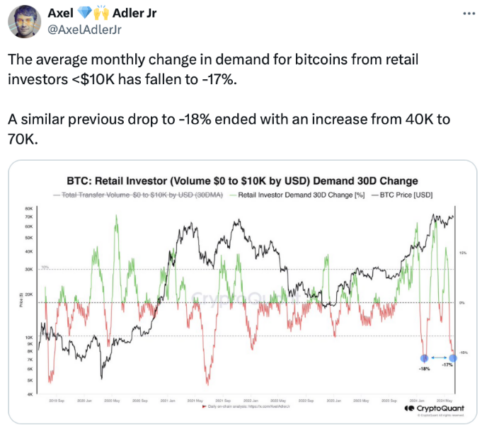 بر اساس دادههایی که در 10 ژوئن توسط اکسل آدلر، نویسنده کریپتو کوانت در 10 ژوئن به اشتراک گذاشته شد، میانگین تغییر ماهانه تقاضا برای بیتکوین در میان سرمایهگذاران خرد – سرمایهگذاران با حجم انتقال تا 10000 دلار – در 30 روز گذشته به منفی 17 درصد کاهش یافته است.