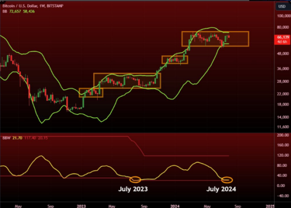 MaxBecauseBTC تاجر کریپتو اضافه کرد: «باندهای بولینگر تایم فریم هفتگی بیت کوین فقط 2 بار دیگر به این میزان محدود شده اند… آوریل 2016 و آگوست 2023».