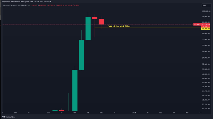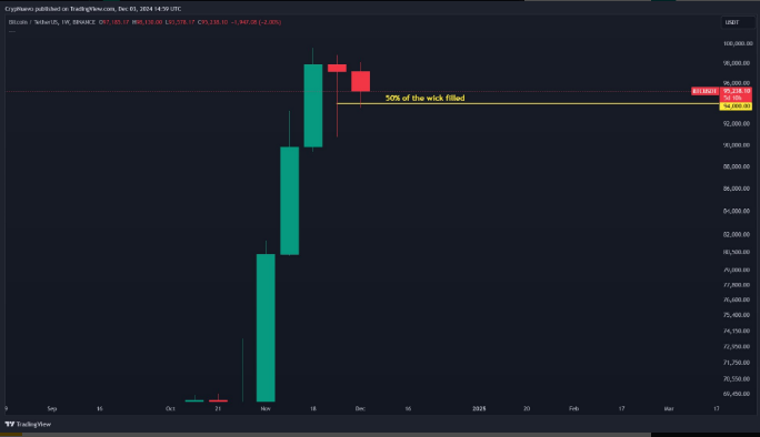 معاملهگر همکار CrypNuevo هشدار داد که یک فیتیله نزولی در بازههای زمانی هفتگی ممکن است بازآزمایی قابلتوجهتری داشته باشد و هدف بالقوه 90000 دلار یا کمتر را ارائه دهد.