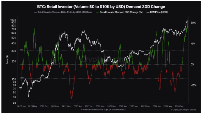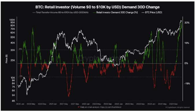 دادههای پلتفرم تحلیل زنجیرهای CryptoQuant تغییر 30 روزه در حجم خریدار را در بین سرمایهگذاران کوچکتر نشان میدهد که از 30 درصد گذشته است.