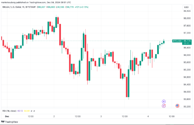 دادههای تریدینگ ویو نشان میدهند که بیتکوین/دلار آمریکا به 97000 دلار نزدیک میشود که 1 درصد در روز افزایش یافته است.
