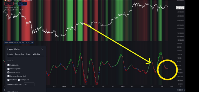 نمودارهای همراه از جمله چاپی از شاخص Liquid Vision را نشان میدهند که نقدینگی بانک مرکزی جهانی را اندازهگیری میکند.