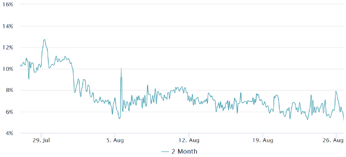 حق بیمه آتی بیت کوین – یک شاخص کلیدی ریسک اشتها برای مشتقات – در ماه گذشته در حدود 6 درصد رکود داشته است. این نشان می دهد که بسیاری از معامله گران حرفه ای در مورد باز کردن موقعیت های خرید اهرمی محتاط هستند.