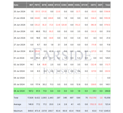 صندوقهای سرمایهگذاری اسپات بیتکوین (ETF) مستقر در ایالات متحده، در میان بازار ارزهای رمزنگاریشده پرچمدار، به بزرگترین روز ورود خالص خود در بیش از یک ماه گذشته رسیدهاند. 11 صندوق در 8 جولای 295 میلیون دلار به دست آوردند.