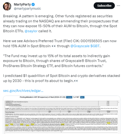 در 2 ژانویه، Advisors Preferred Trust، مدیر صندوق سرمایه گذاری مشترک، دفترچه خود را طوری تنظیم کرد که این صندوق «ممکن است تا 15٪ از کل دارایی های خود را سرمایه گذاری کند تا به طور غیرمستقیم در معرض بیت کوین قرار گیرد، از طریق سهام تراست بیت کوین گری اسکیل، استراتژی ETF بیت کوین پروشرز، و معاملات آتی بیت کوین.