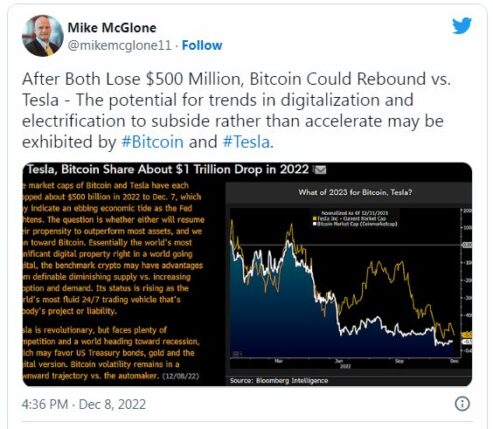 مک گلون در توییتی نوشت که هر دو دارایی، BTC و TSLA، از ماه فوریه تاکنون 500 میلیون دلار از ارزش بازار خود را از دست داده اند.