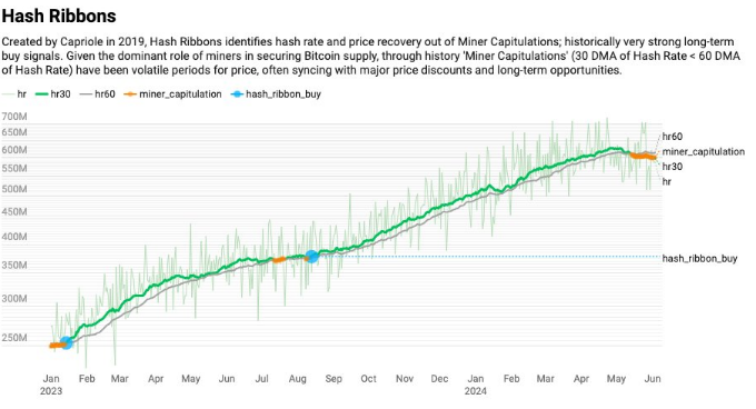 در آغاز ماه ژوئن، چارلز ادواردز، بنیانگذار صندوق تامینی کریپتو Capriole، استدلال کرد که نشانگر روبانهای هش بیتکوین که توسط شرکت او ایجاد شده بود، سیگنال خرید را منعکس میکند که منعکسکننده کندی نسبی در قدرت محاسباتی شبکه است.