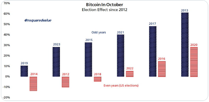 تیموتی پترسون، تحلیلگر بیت کوین در آخرین تحلیل خود در X می گوید عملکرد بیت کوین در طول سال های انتخابات ایالات متحده به طور قابل توجهی ضعیف تر از سال های غیرانتخاباتی است.