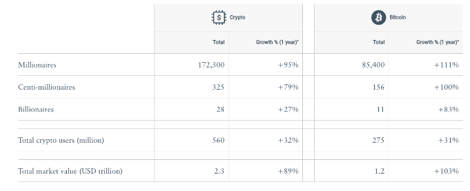 فقط بیت کوینرها هم نبودند. در حال حاضر 172300 نفر در سراسر جهان بیش از 1 میلیون دلار ارز دیجیتال دارند که 95 درصد از 88200 نفر در سال گذشته افزایش یافته است.
