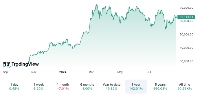 طبق دادههای تریدینگ ویو، قیمت بیتکوین در سال گذشته 142 درصد رشد داشته است و به طور پیوسته از قیمت 26100 دلار در 27 اوت 2023 به قیمت 63100 دلار در زمان انتشار رسیده است.