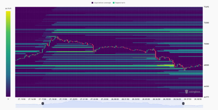 آخرین دادههای منبع نظارتی کوین گلس، تمرکز نقدینگی را در حول و حوش قیمت نقطهای نشان میدهد، با منطقه حدود 67000 دلار که اکنون نزدیکترین نقطه مورد علاقه در زیر است.