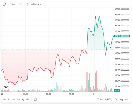 طبق گزارش تریدینگ ویو، این دارایی در اوایل معاملات در 21 اکتبر به 69,380 دلار رسید. با این حال، در مقاومت رد شد و در زمان انتشار به 69033 دلار بازگشت.