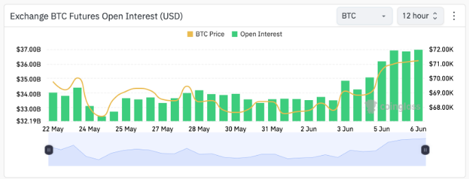 بر اساس دادههای کوین گلس، OI بیتکوین در این دوره سه روزه ۲.۰۲ میلیارد دلار جهش کرد و در ۶ ژوئن به ۳۶.۹۲ میلیارد دلار رسید.