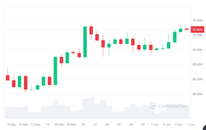بر اساس داده های کوین مارکت کپ، قیمت بیت کوین در زمان نگارش این مقاله 70890 دلار معامله می شود که 4.23 درصد در هفت روز گذشته افزایش یافته است.