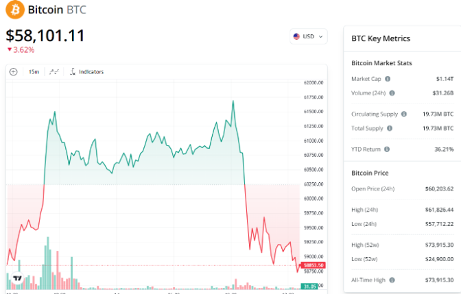 با این حال، طبق داده ها، بیت کوین در ۲۴ ساعت گذشته بیش از ۳.۶ درصد سقوط کرد و تا ساعت ۸:۳۵ صبح به ۵۸۱۰۱ دلار معامله شد.