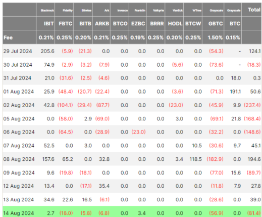 طبق دادههای Farside Investors، ورودیها به صندوقهای نقدی بیتکوین (ETF) آمریکا برای دو روز متوالی مثبت بود، اما در 14 آگوست دوباره منفی شد و خالص خروجیها از 81 میلیون دلار فراتر رفت.