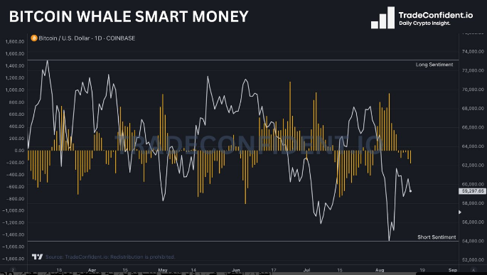 بر اساس احساسات بازار در مورد نهنگ های بیت کوین یا دارندگان بزرگ، BTC احتمالاً به سمت پشتیبانی 56000 دلاری می رود، طبق پست 14 آگوست X توسط پلتفرم تحقیقات ارز دیجیتال Trade Confident که نوشت: