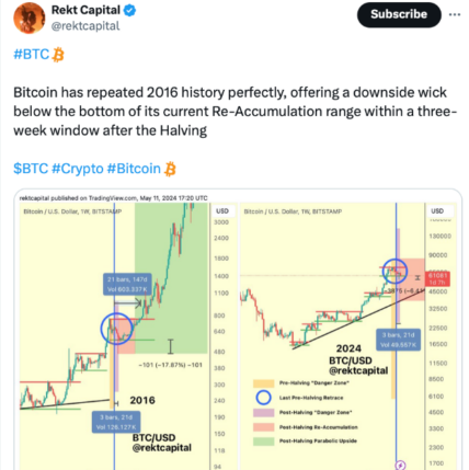 رکت کپیتال، تاجر رمزارز با نام مستعار، در پستی در 11 می در X اعلام کرد: بیت کوین تاریخ 2016 را کاملاً تکرار کرده است، و یک فتیله نزولی در زیر محدوده انباشت مجدد فعلی خود در یک پنجره سه هفته ای پس از هاوینگ ارائه می دهد.