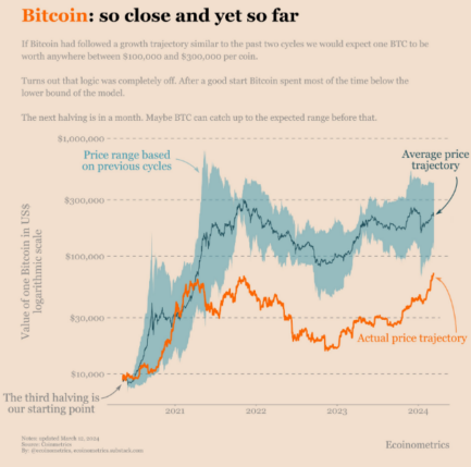 ثانیاً، طبق دادههای تاریخی که توسط Ecoinometrics در یک پست X 12 مارس به اشتراک گذاشته شده است، بیت کوین هنوز به مسیر رشد خود از چرخههای نصفسازی قبلی نرسیده است: