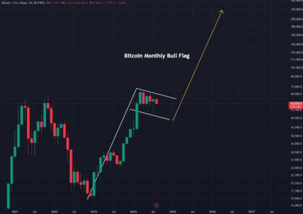 به گفته تحلیلگر محبوب ساتوشی فلیپر، که در پستی در 4 آگوست X نوشت : قیمت بیت کوین ممکن است به دلیل ظهور پرچم گاوی – یک الگوی نمودار صعودی که برای شناسایی رالی های آینده استفاده می شود – سقوط کند: