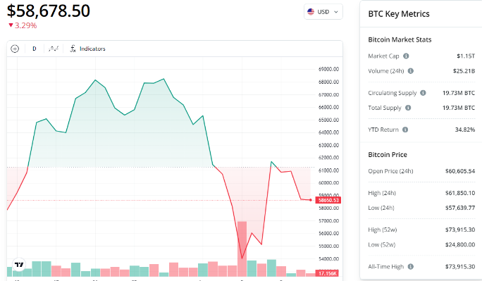 در 24 ساعت گذشته، قیمت بیت کوین 3.9 درصد کاهش یافت و در ساعت 08:03 صبح UTC در 12 اوت به 58930 دلار معامله شد و از بالاترین سطح هفتگی 62510 دلار سقوط کرد.