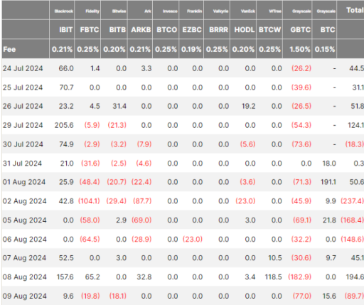 با این حال، جریان ورودی به صندوقهای نقدی مبادله بیتکوین (ETF) مستقر در ایالات متحده کم است. بر اساس دادههای سرمایهگذاران فارسید، ETF بیتکوین ایالات متحده در 9 آگوست بیش از 89 میلیون دلار خروجی خالص منفی داشت.