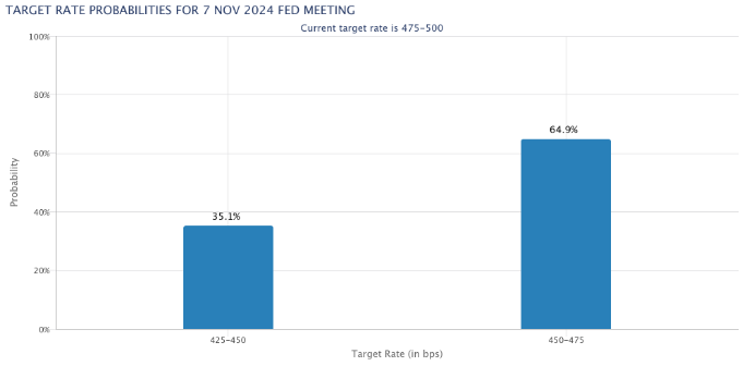 دادههای FedWatch Tool گروه CME نشان میدهد که احتمال کاهش 0.5 درصدی دیگر نسبت به پیگیری کوچکتر 0.25 درصدی در نشست بعدی فدرال رزرو در 7 نوامبر کمتر است.